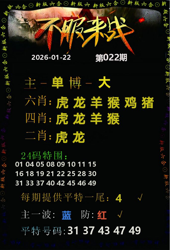 016期:A级大公开:676383.COM长跟必赢 016期四肖:【龙马鼠鸡】 八码:【26 38 12 36 06 30 09 45】 016期三肖:【龙马鼠】 六码:【26 38 12 36 06 30】 016期二肖:【龙马】 四码:【26 38 12 36】 016期:一肖一码【龙26】信心十足,大胆下注!